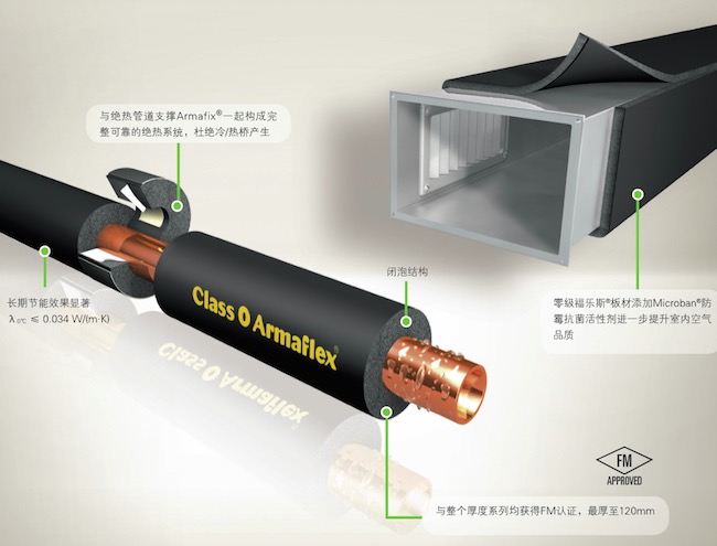 福樂斯? 零級是持續有效防止結露的專業柔性絕熱材料。低導熱系數和高抗水汽滲透能力的結合使該產品能長期減少能耗和抵御水汽滲透。其精細發泡構成了阻止水汽滲透的連續屏障,得益于無數獨立的閉泡結構,產品在整個厚度方向上具備了持續的防潮性能。通過采用高品質原材料及領先生產工藝的結合,福樂斯? 零級兼具了優秀的絕熱性能和防火性能。產品的性能和品質可靠性,通過Factory Mutual (FM)工業保險認證而得到第三方保證。福樂斯? 零級產品是業內首家通過FM認證且應用歷史最悠久的絕熱產品,認可范圍涵蓋所有管材和板材產品。