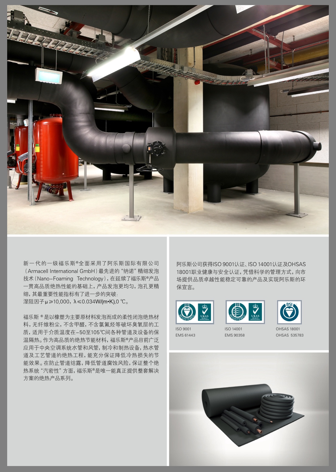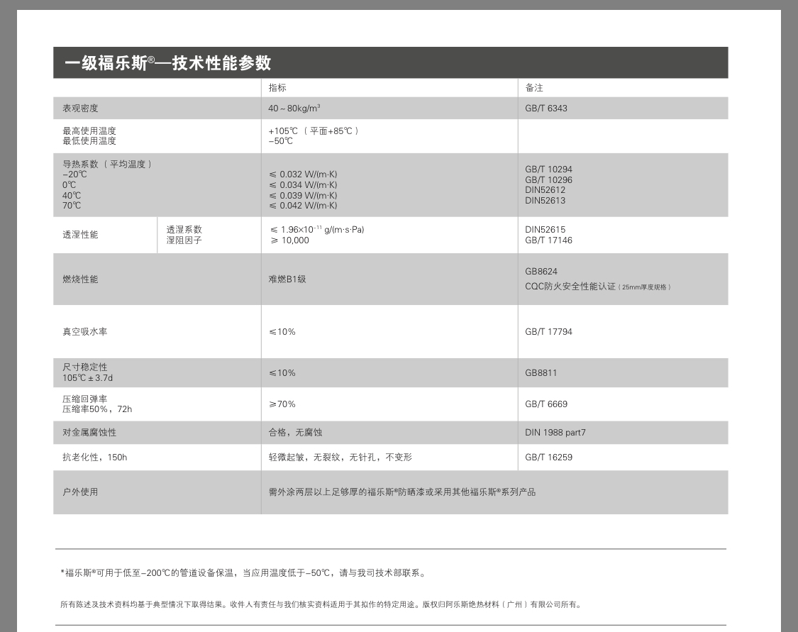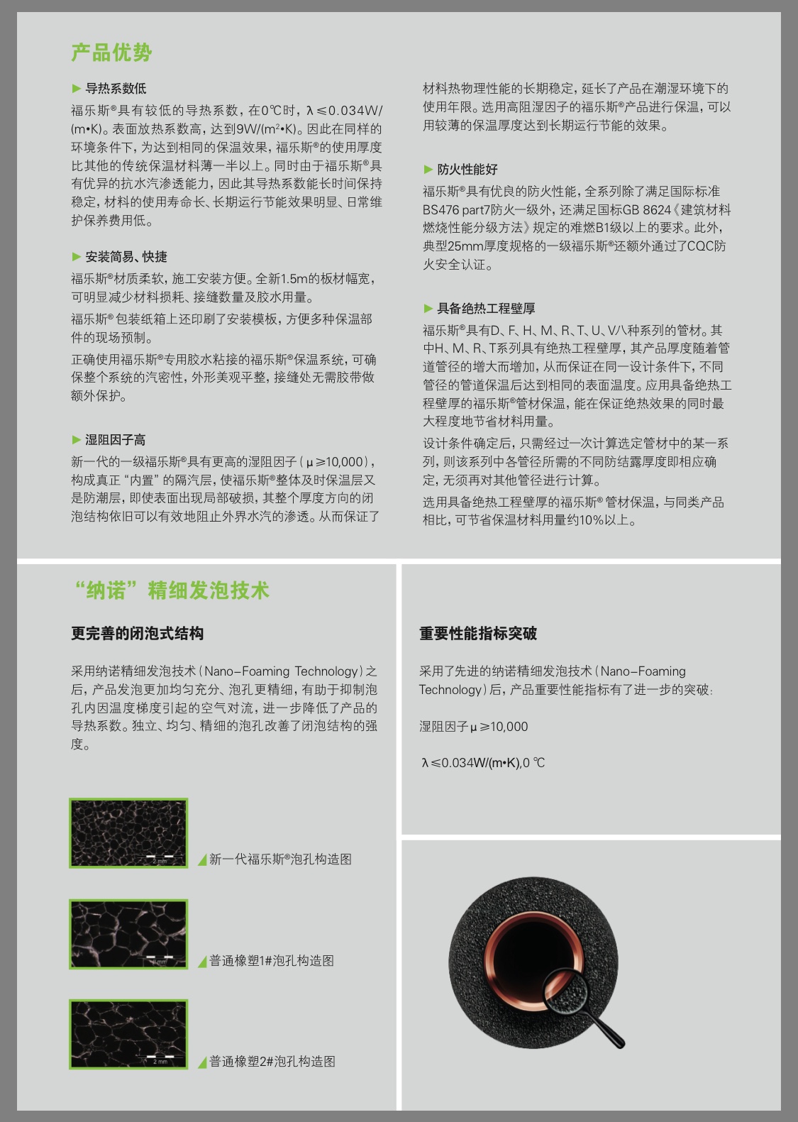 新一代的福樂斯?一級橡塑全面采用了阿樂斯國際有限公司(Armacell International GmbH)最先進的“納諾”精細發泡技術(Nano-Foaming Technology),在延續了福樂斯?產品一貫高品質絕熱性能的基礎上,產品發泡更均勻,泡孔更精細,其最重要性能指標有了進一步的突破: 濕阻因子μ ≥ 10,000,λ0 ℃ ≤ 0.034 W/(m ? K)。